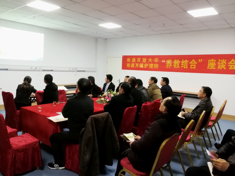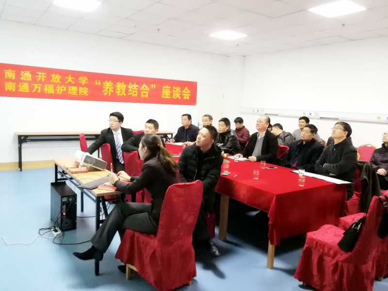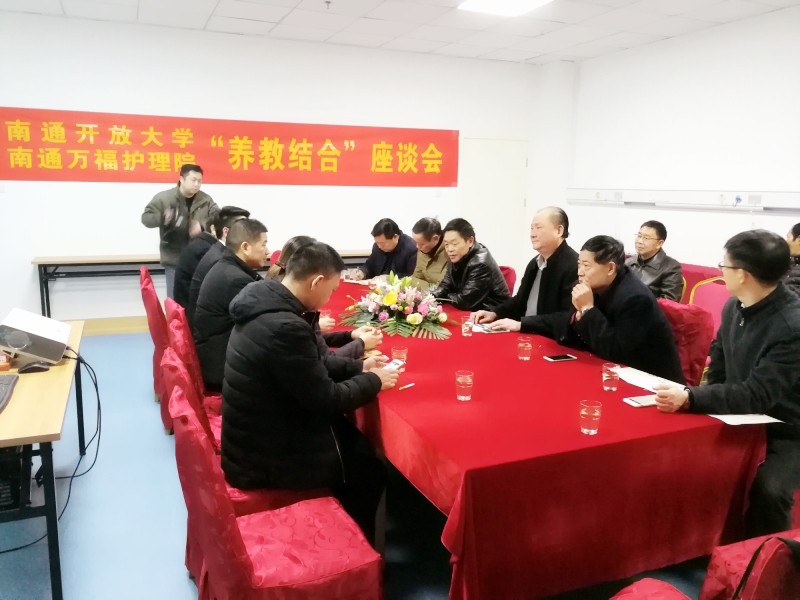 2018年1月6日下午,由南通开放大学、南通万福护理院联合召开的“养教结合”座谈会圆满落下帷幕。本次座谈会由南通开放大学副校长景圣琪先生及万福护理院总经理朱华先生牵头举办,港闸区民政局、教育局、商务局等各部门领导嘉宾出席了此次座谈会。